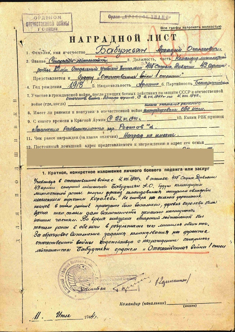 В архиве Минобороны сохранился наградной лист о вручении Бабуджьяну ордена Красной Звезды. Кстати, награду он получил гораздо позже, уже после возвращения в Ростов-на-Дону. Кроме того, имел орден Отечественной войны первой степени.