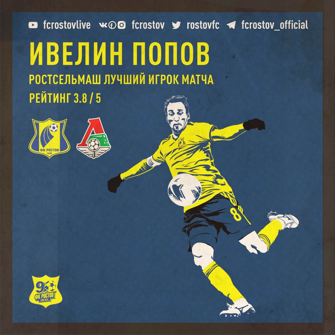 Полузащитник Ивелин Попов признан лучшим игроком нашей команды в игре с «Локомотивом». Во встрече с москвичами капитан «Ростова» забил единственный гол нашей команды. В результате голосования болельщиков средний балл Попова оказался самым высоким в команде — 3,8 из 5.